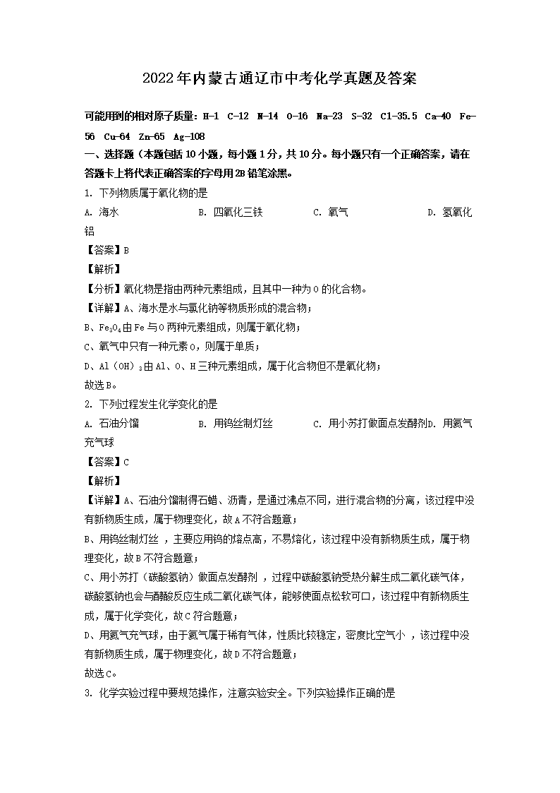 【文档预览】 文档大全网整理发布2022年内蒙古通辽市中考化学真题及答案(Word版),前五页预览如下: