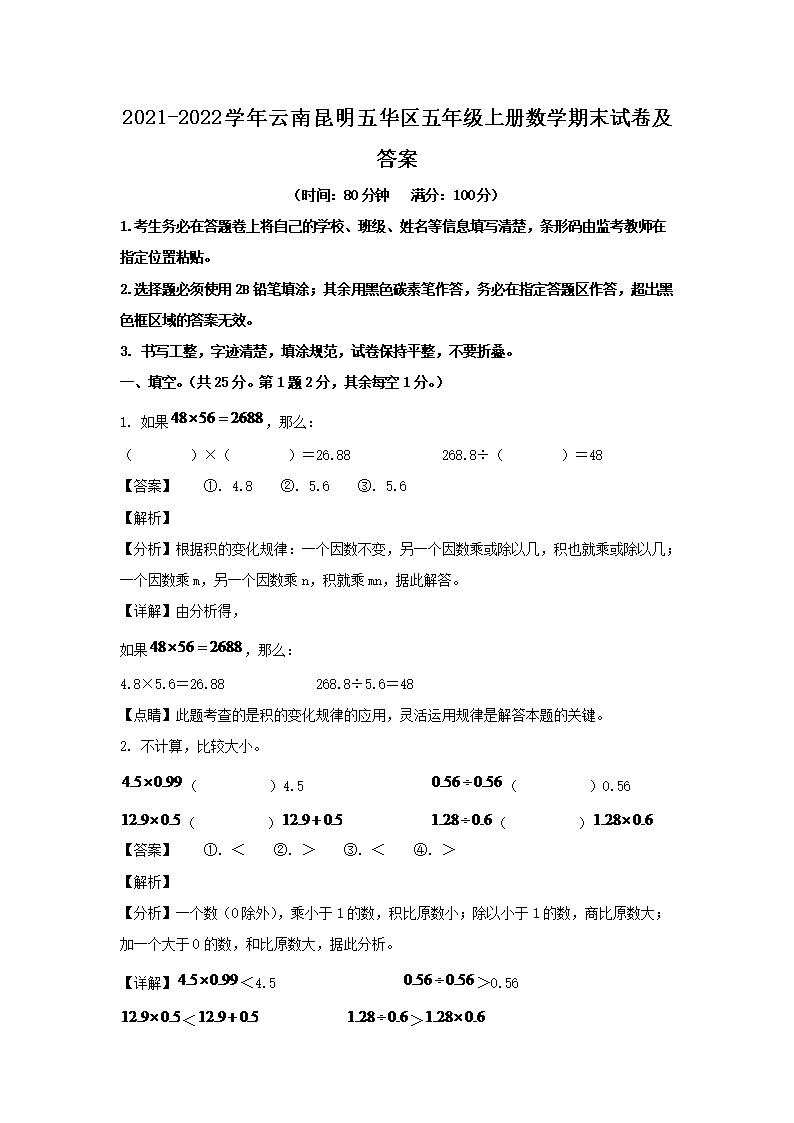 2021-2022学年云南昆明五华区五年级上册数学期末试卷及答案(Word版)08-26