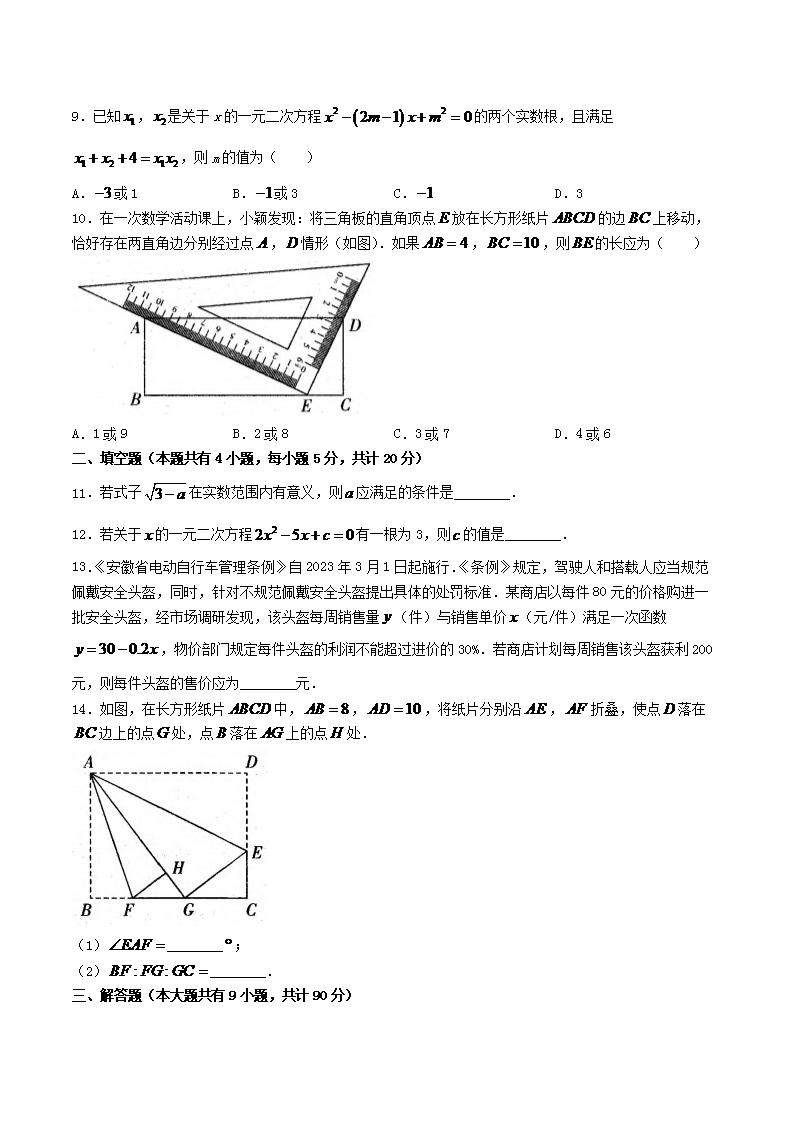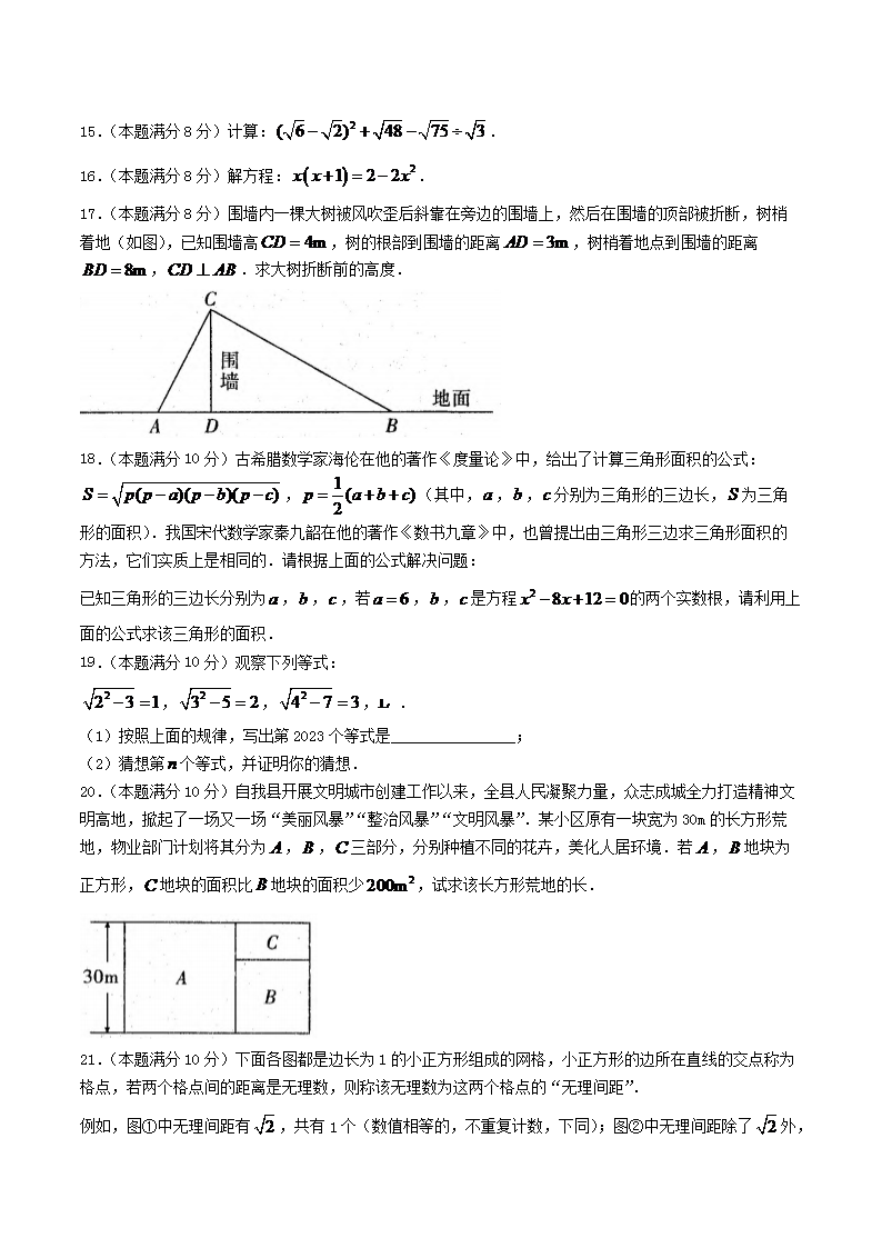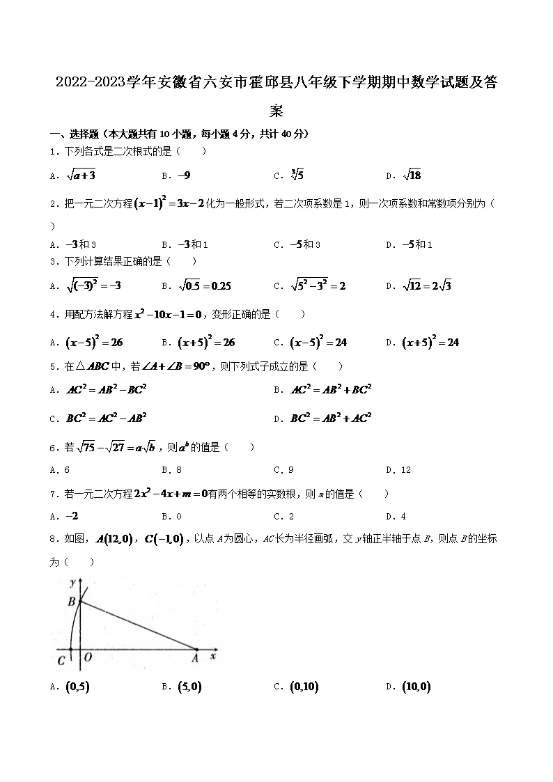 2022-2023学年安徽省六安市霍邱县八年级下学期期中数学试题及答案(Word版)10-12