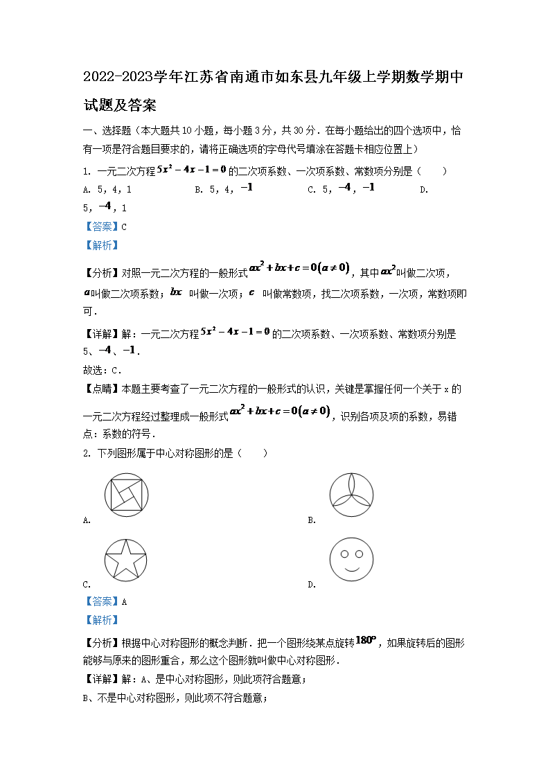 2022-2023学年江苏省南通市如东县九年级上学期数学期中试题及答案(Word版)09-26