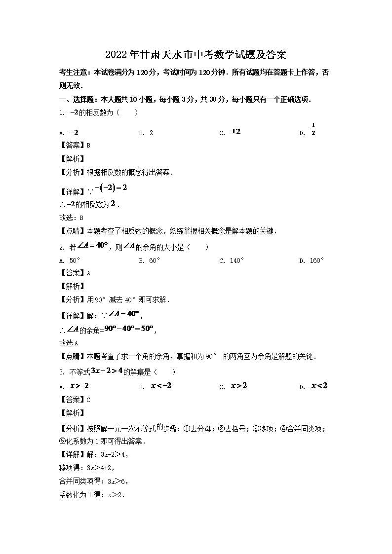 【文档预览】 文档大全网整理发布2022年甘肃天水市中考数学试题及答案(Word版),前五页预览如下: