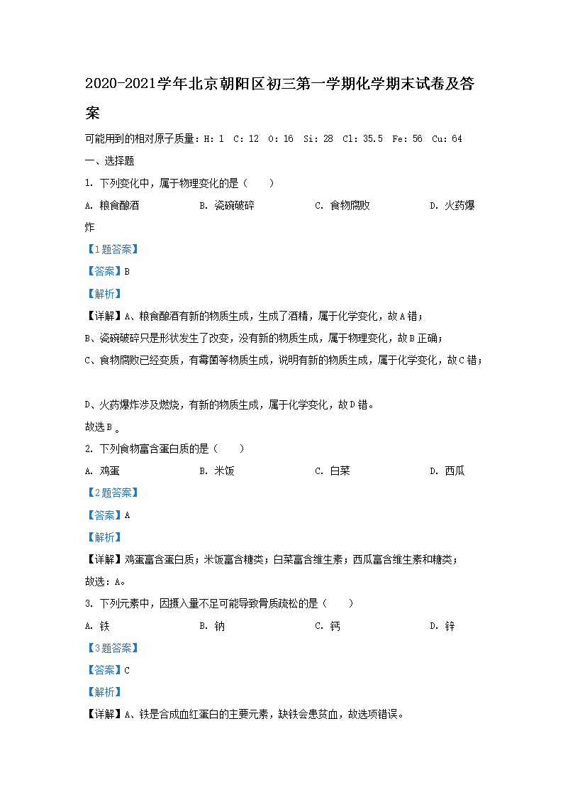 【文档预览】 文档大全网整理发布2020-2021学年北京朝阳区初三第一学期化学期末试卷及答案(Word版),前五页预览如下: