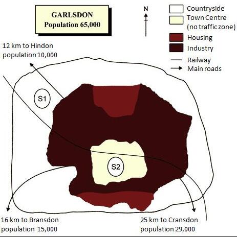 The map below is of the town of Garlsdon. A new supermarket (S) is planned for the town. The map shows two possible sites for the supermarket. Summarise the information by selecting and reporting the main features, and make comparisons where relevant. You should write at least 150 words. Allow yourself 20 minutes for this task.