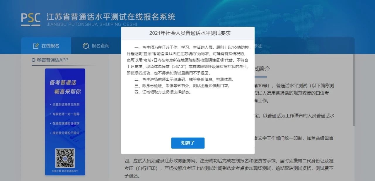 本人已知晓江苏省普通话水平测试疫情防控要求,愿意遵守相关规定,承担社会疫情防控责任,并做如下: