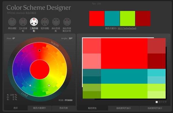 2、如果你还在为获取web颜色而烦恼的话,建议你使用Color Scheme Designer取色工具,以不同的模式,可以让你一下获取相近的四个颜色。