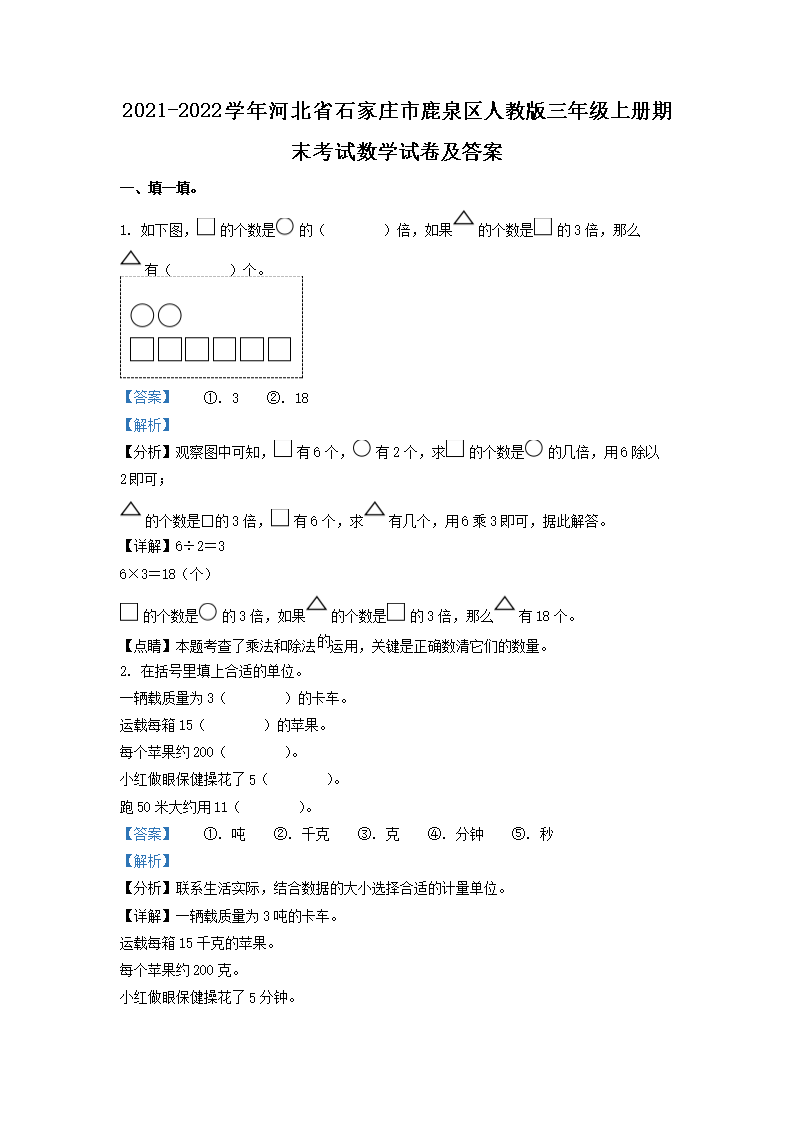 【文档预览】 文档大全网整理发布2021-2022学年河北省石家庄市鹿泉区人教版三年级上册期末考试数学试卷及答案(Word版),前五页预览如下: