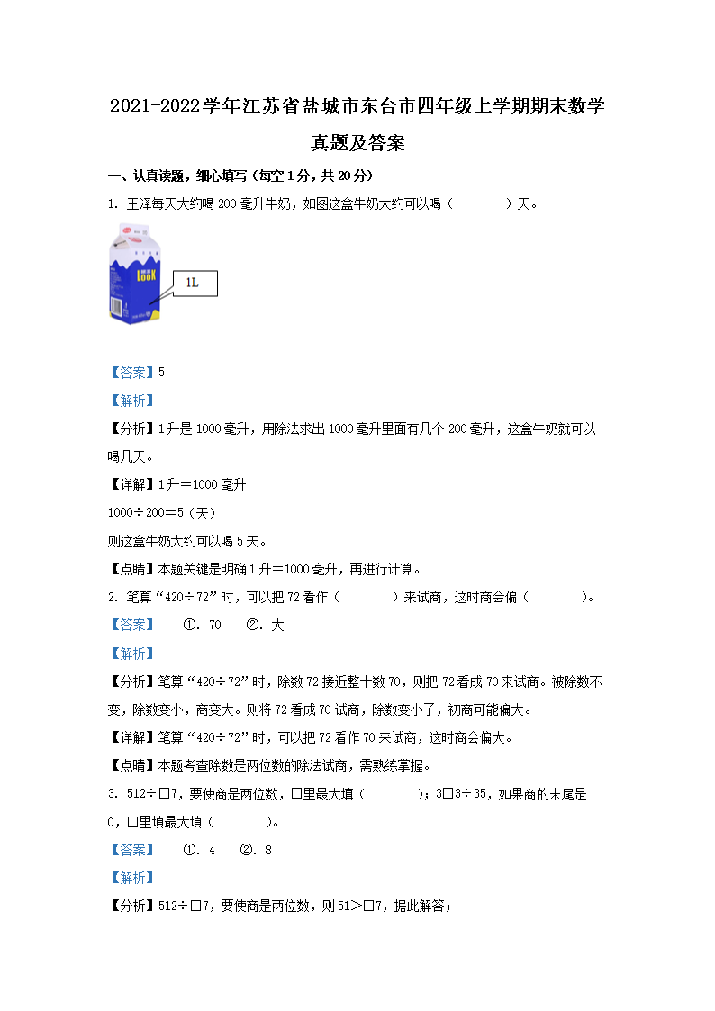 2021-2022学年江苏省盐城市东台市四年级上学期期末数学真题及答案(Word版)07-29