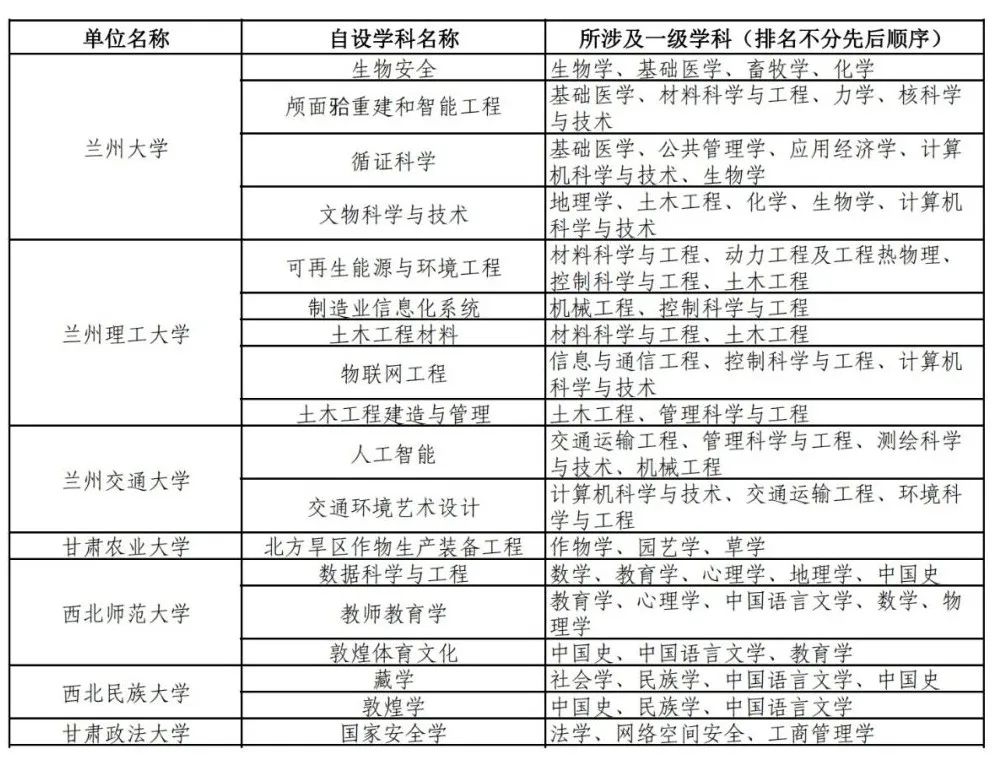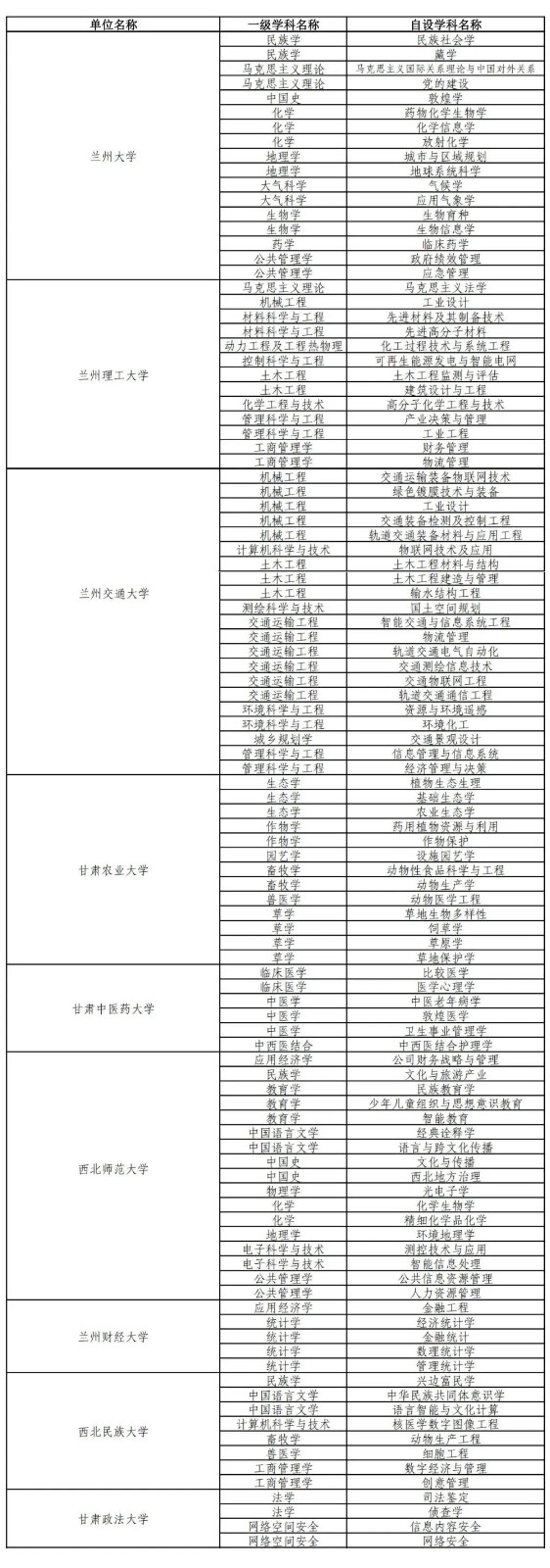 甘肃完成备案的学位授予单位自设二级学科和交叉学科名单10-12
