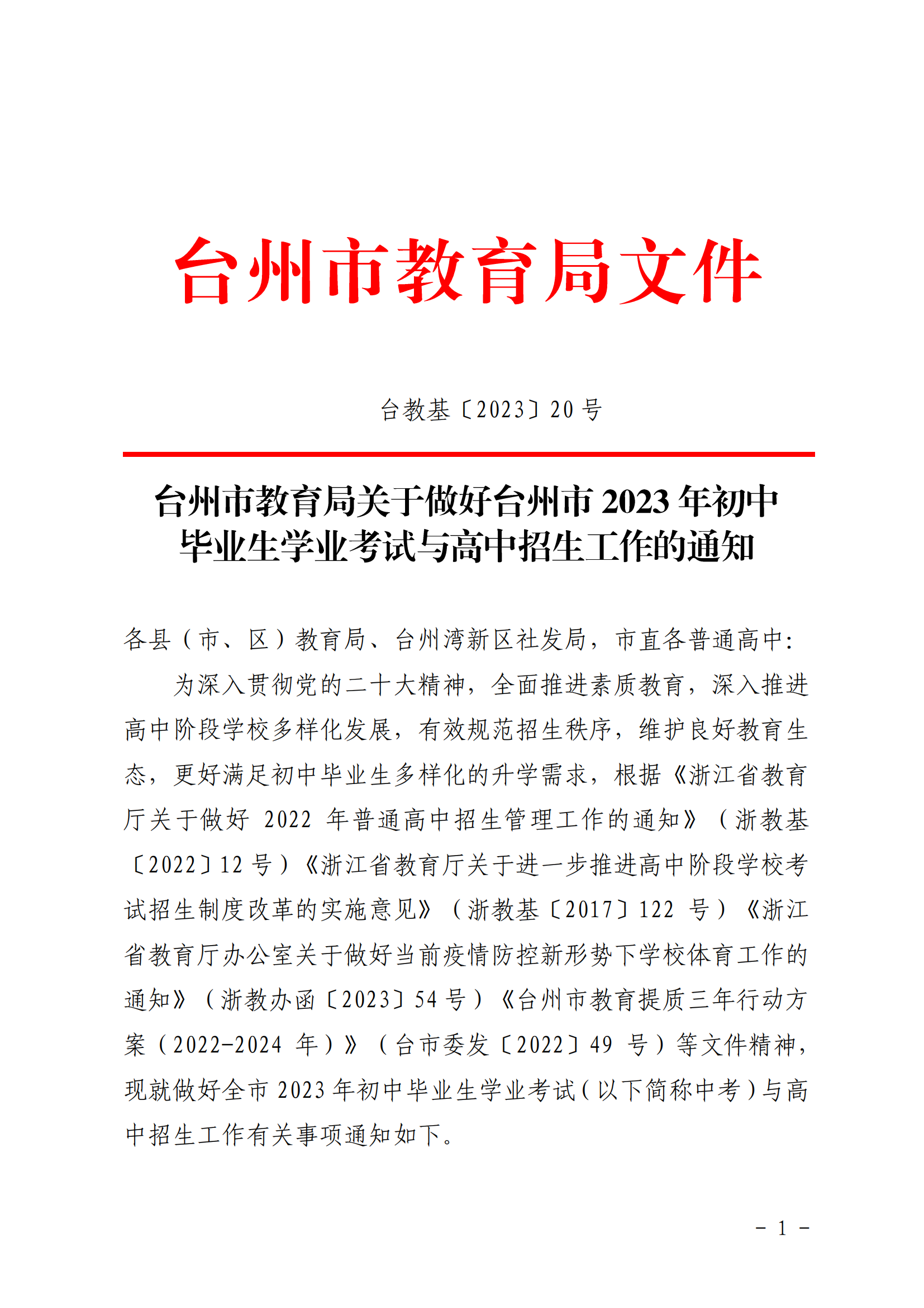 【#中考# 导语】®文档大全网从台州市教育局了解到,浙江台州2023年初中毕业生学业考试与高中招生工作的通知已发布,详细内容如下: