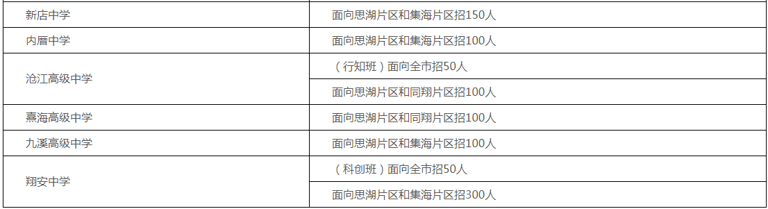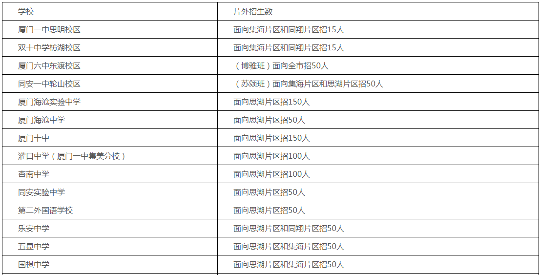 厦门一中海沧校区、厦门外国语学校集美校区、双十中学翔安校区、厦门六中同安校区、厦门二中集美校区、科技中学翔安校区、集美中学后溪校区、厦门实验中学汀溪校区普通生招生计划的30%指标面向属地所在片区初中学校招收定向生,10%指标面向思明湖里片区初中学校招收定向生。