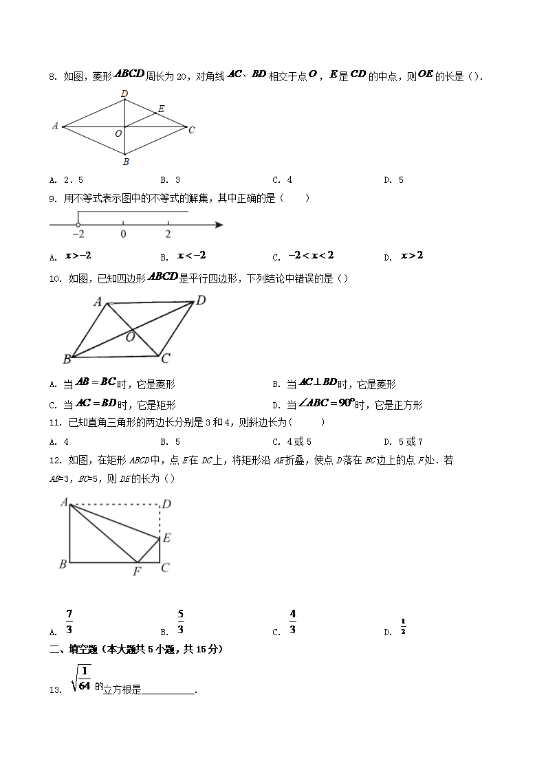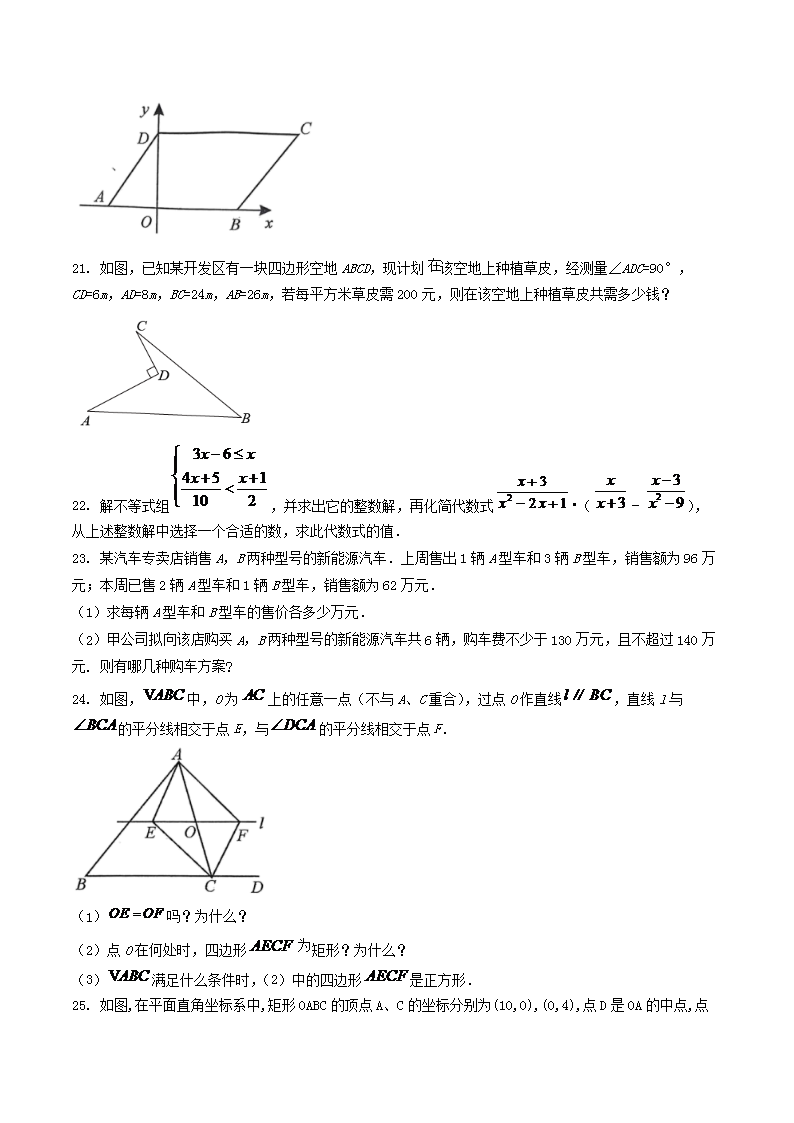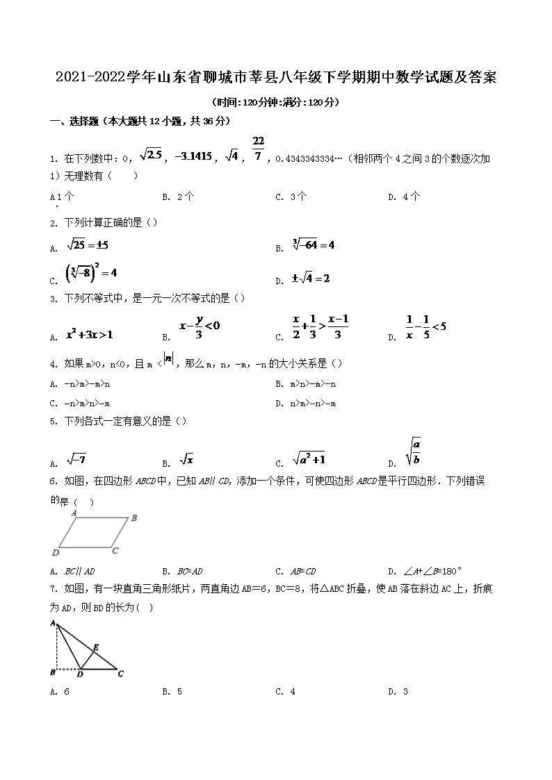 2021-2022学年山东省聊城市莘县八年级下学期期中数学试题及答案(Word版)10-14
