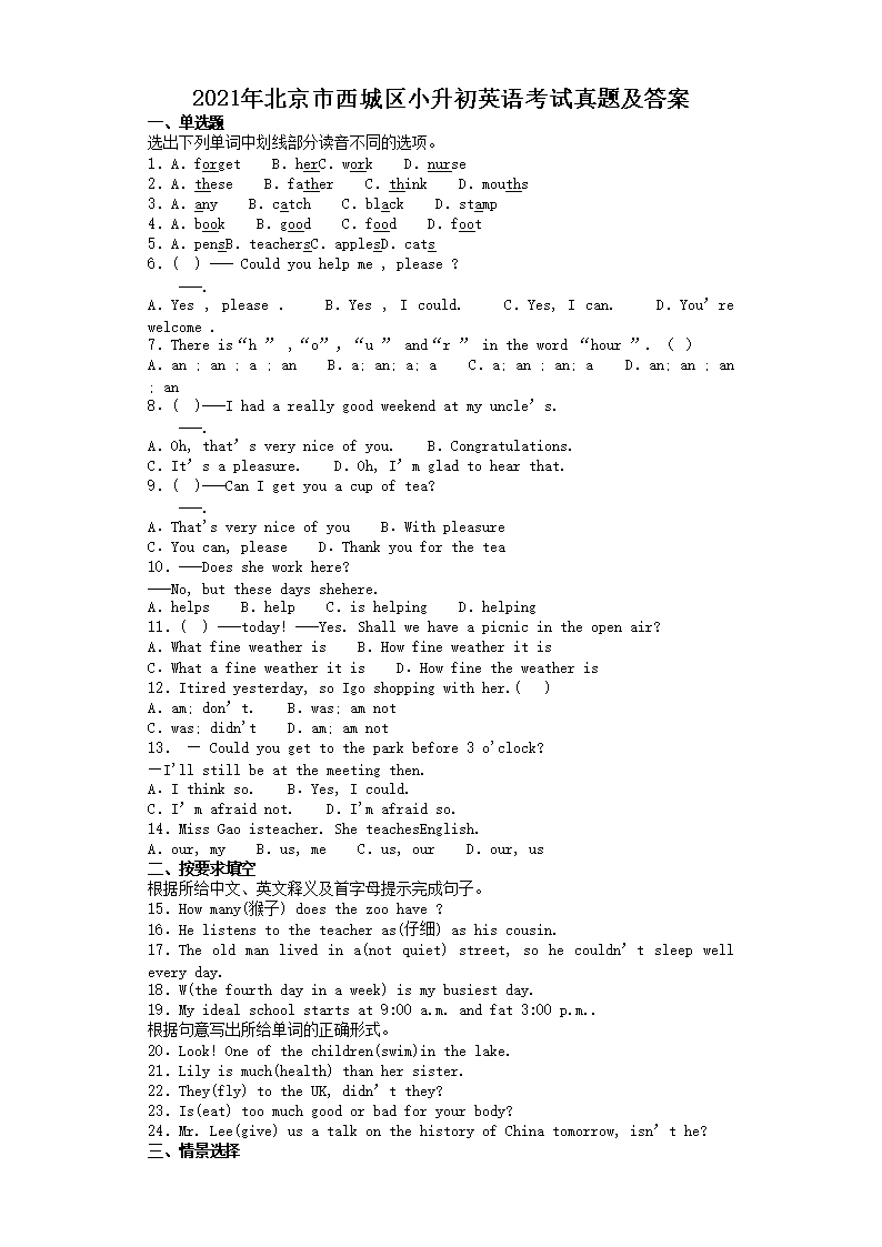 2021年北京市西城区小升初英语考试真题及答案(Word版)07-01