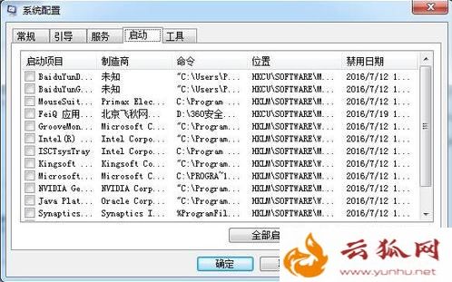 4、切换到“启动”,点击“全部禁用”,并点击确定;