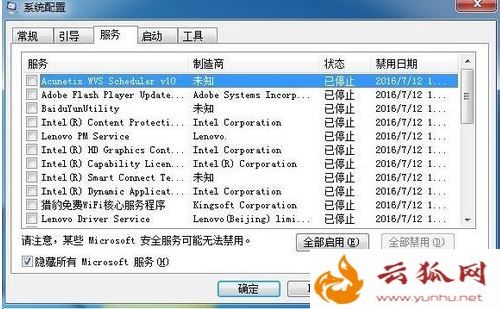3、切换到“服务”选项卡,勾选“隐藏所有Microsoft服务”复选框,单击“全部禁用”按钮;