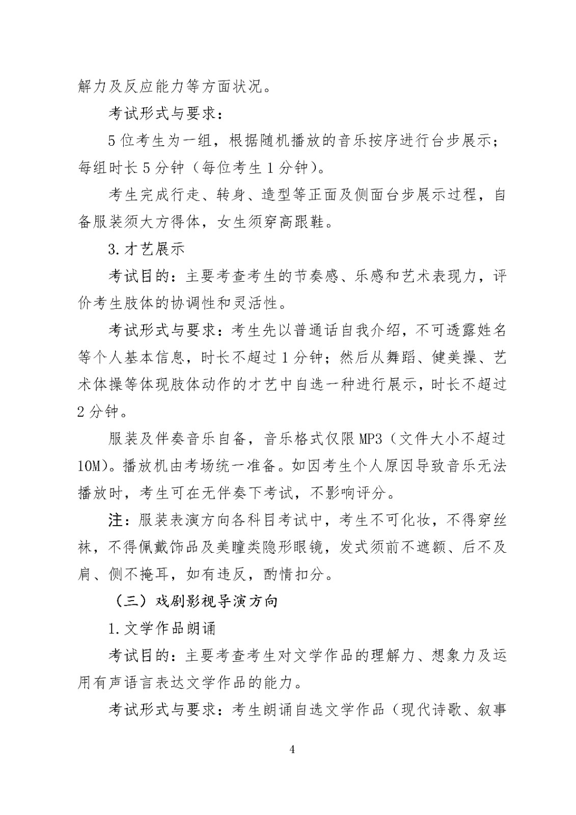 考试包括文学作品朗诵、自选曲目演唱、形体技能展现、命题即兴表演四个科目。