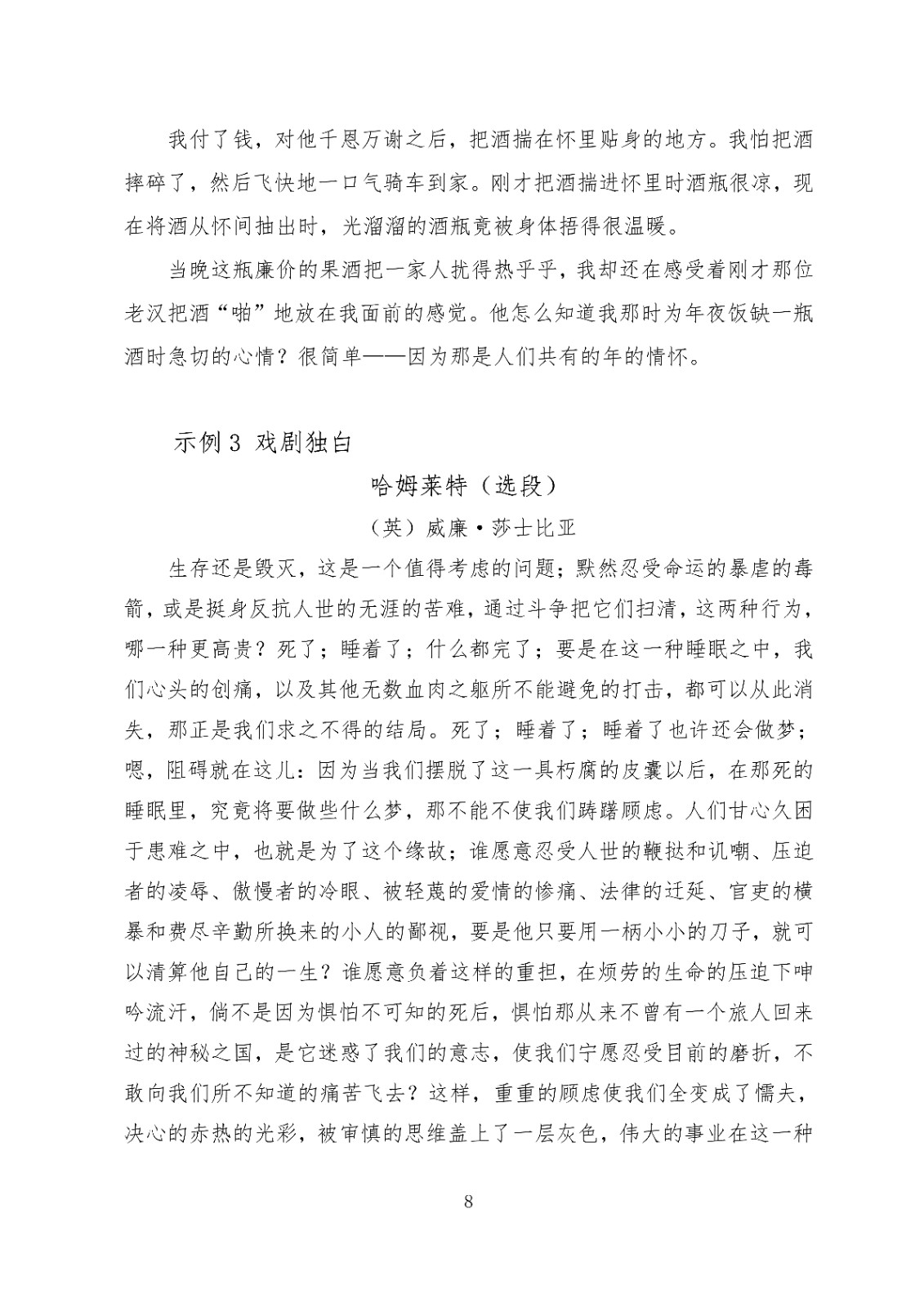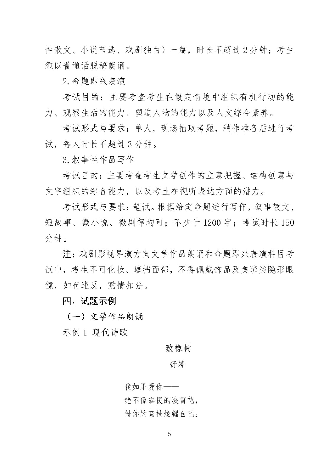 考试目的:主要考查考生对文学作品的理解力、想象力及运用有声语言表达文学作品的能力。考试形式与要求:考生朗诵自选文学作品(现代诗歌、叙事性散文、小说节选、戏剧独白)一篇,时长不超过2分钟;考生须以普通话脱稿朗诵。