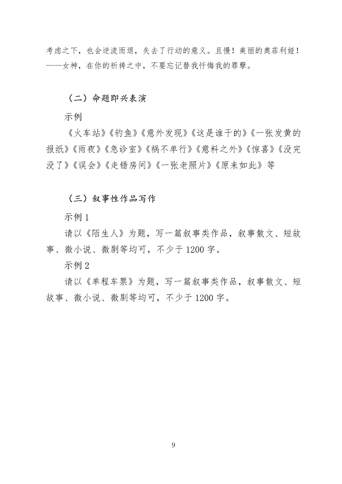 考试包括文学作品朗诵、命题即兴表演、叙事性作品写作三个科目。