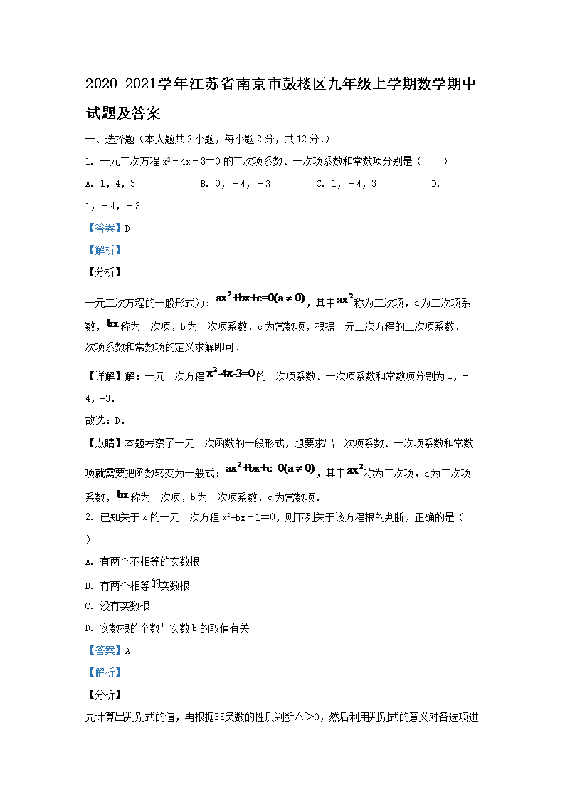 【文档预览】 文档大全网整理发布2020-2021学年江苏省南京市鼓楼区九年级上学期数学期中试题及答案(Word版),前五页预览如下:
