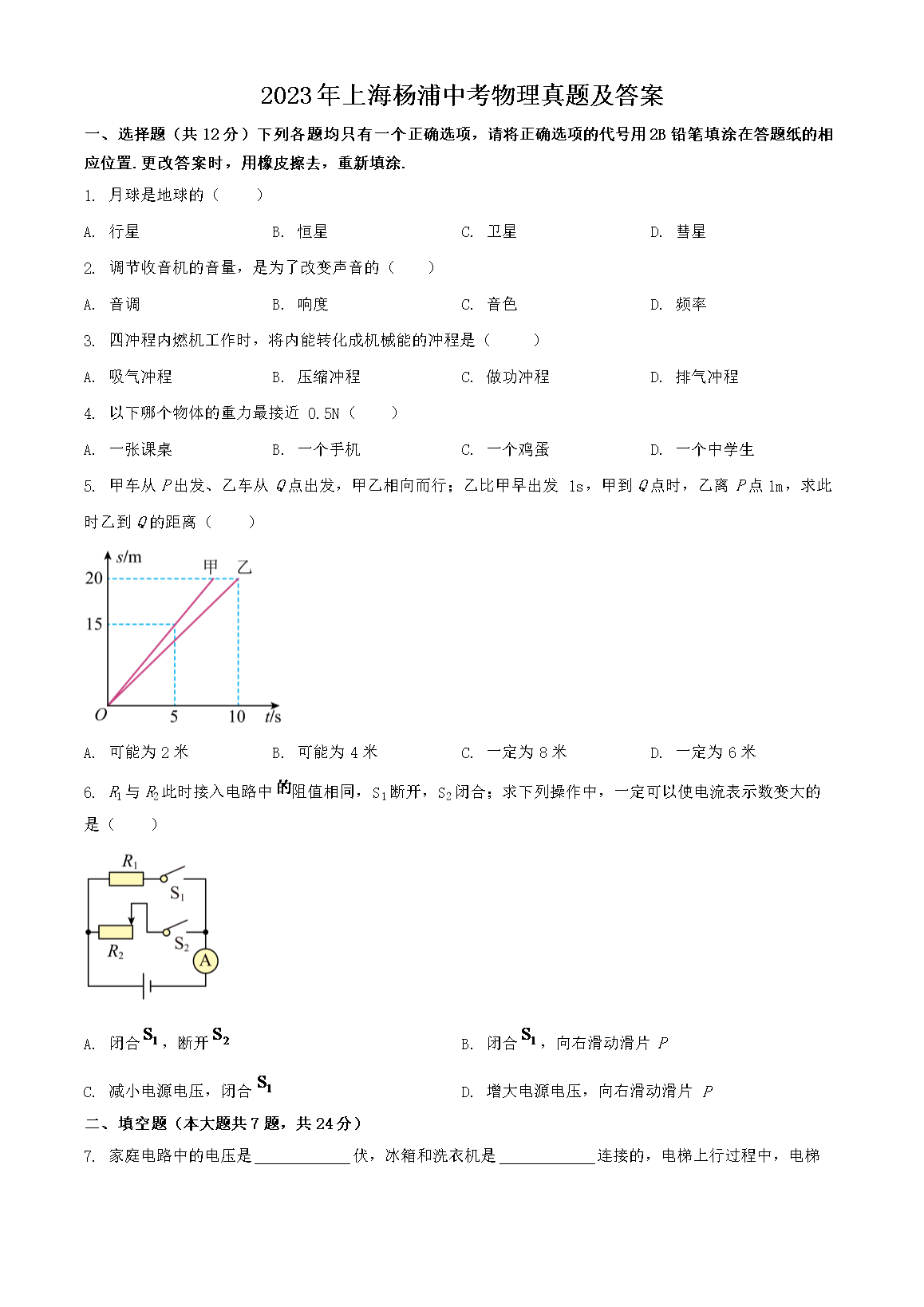 2023年上海杨浦中考物理真题及答案(Word版)06-22