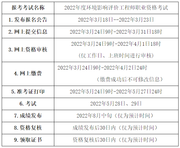 根据《人力资源社会保障部办公厅关于2022年度专业技术人员职业资格考试计划及有关事项的通知》(人社厅发〔2022〕3号)要求,2022年度环境影响评价工程师职业资格考试于5月28日、29日举行,现将有关事项通知如下: