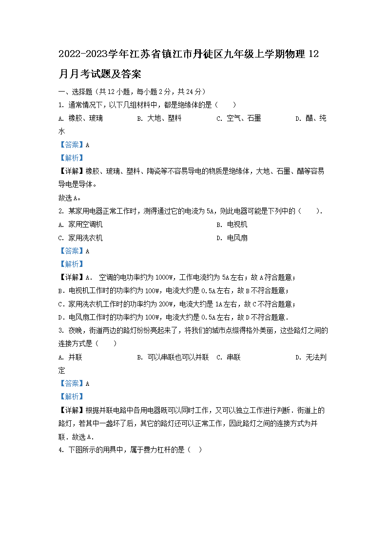 2022-2023学年江苏省镇江市丹徒区九年级上学期物理12月月考试题及答案(Word版)10-17