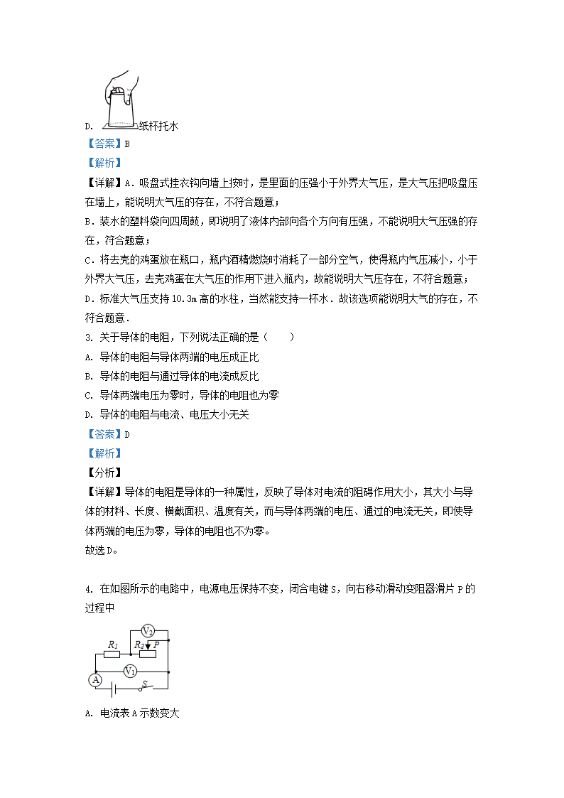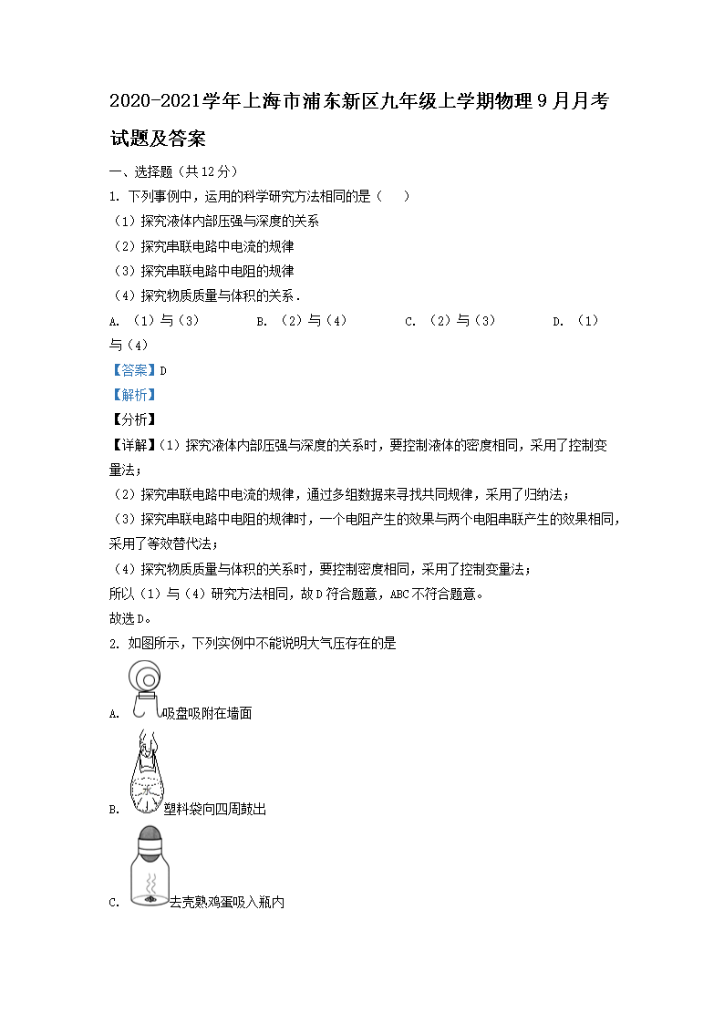 2020-2021学年上海市浦东新区九年级上学期物理9月月考试题及答案(Word版)10-21