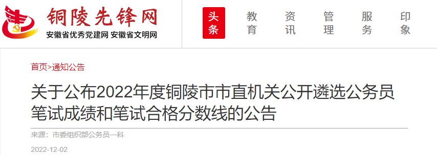 2022年安徽铜陵市直机关公开遴选公务员笔试成绩及合格分数线(已公布)12-06