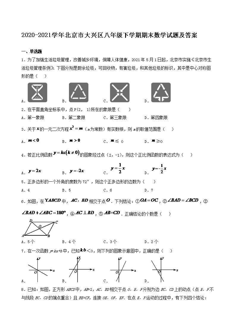 【文档预览】 文档大全网整理发布2020-2021学年北京市大兴区八年级下学期期末数学试题及答案(Word版),前五页预览如下: