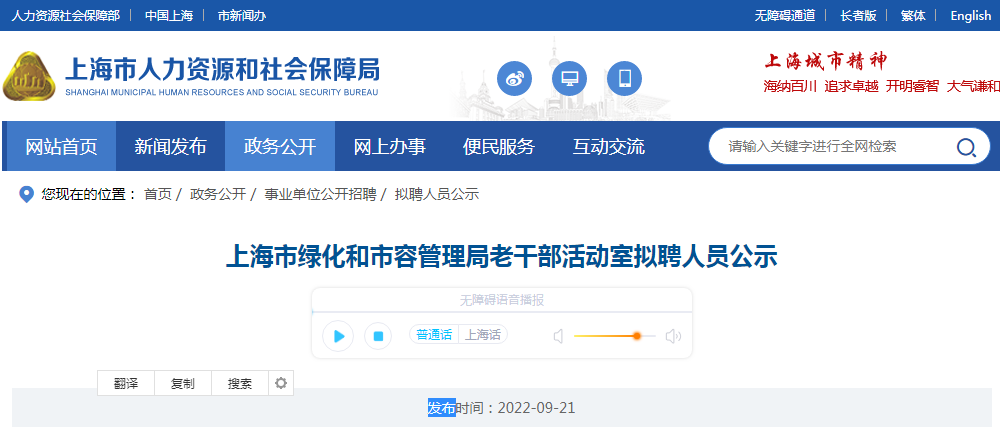 2022年上海市绿化和市容管理局老干部活动室拟聘人员公示09-23