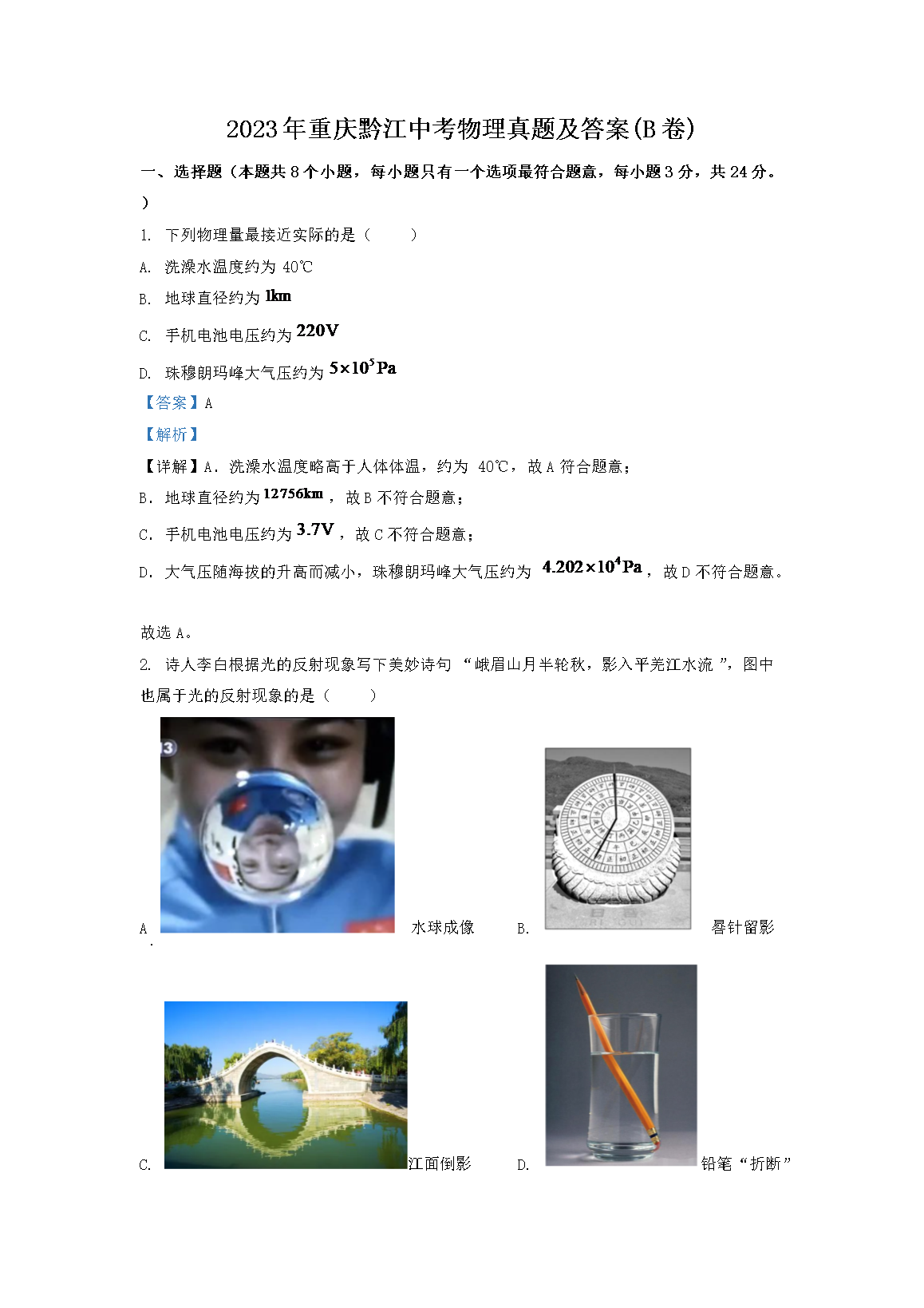 2023年重庆黔江中考物理真题及答案(B卷)(Word版)06-15