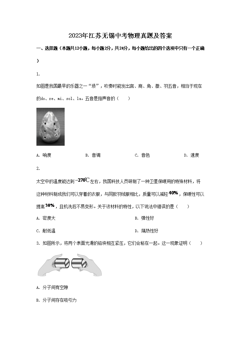 2023年江苏无锡中考物理真题及答案(Word版)07-15