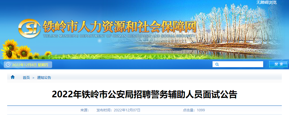 2022年辽宁铁岭市公安局招聘警务辅助人员面试时间:12月10日12-09