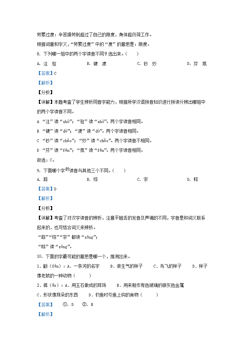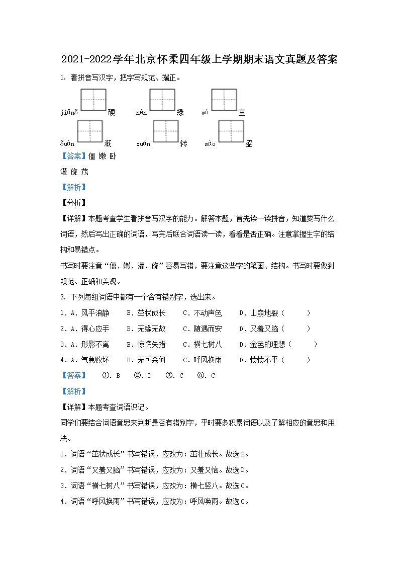 2021-2022学年北京怀柔四年级上学期期末语文真题及答案(Word版)06-28