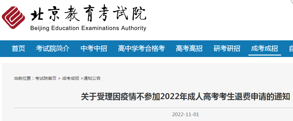 关于受理因疫情不参加2022年北京市成人高考考生退费申请的通知11-02