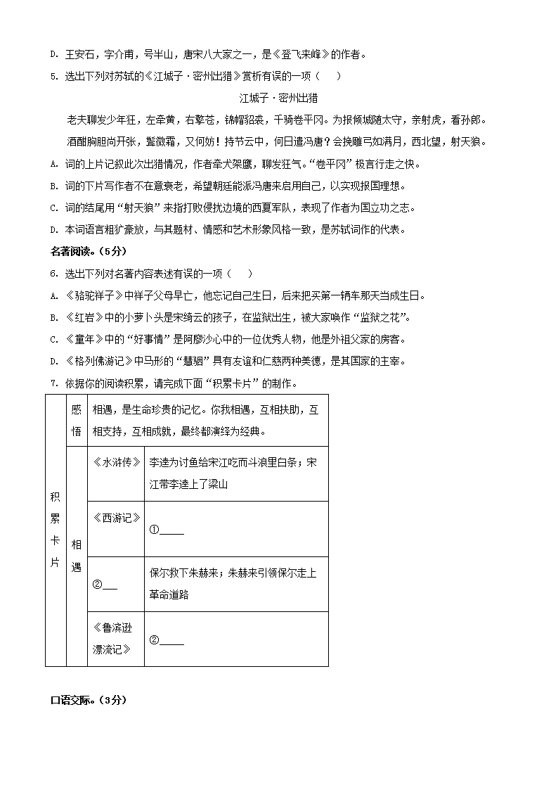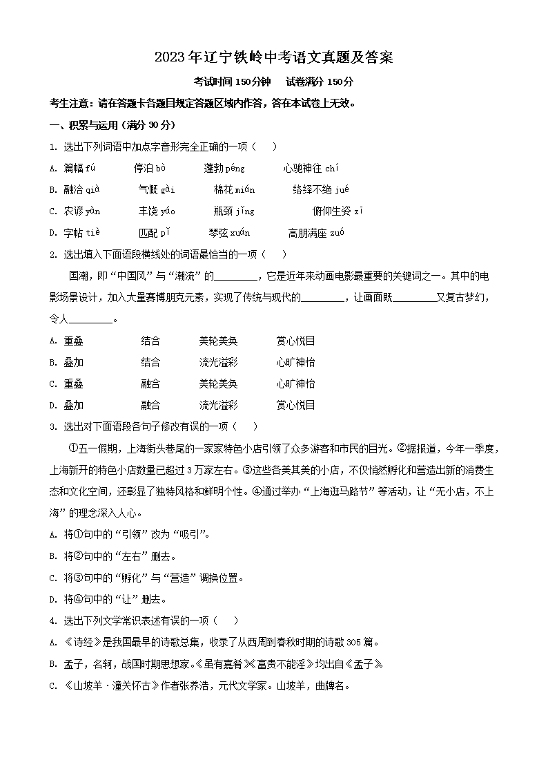2023年辽宁铁岭中考语文真题及答案(Word版)08-09