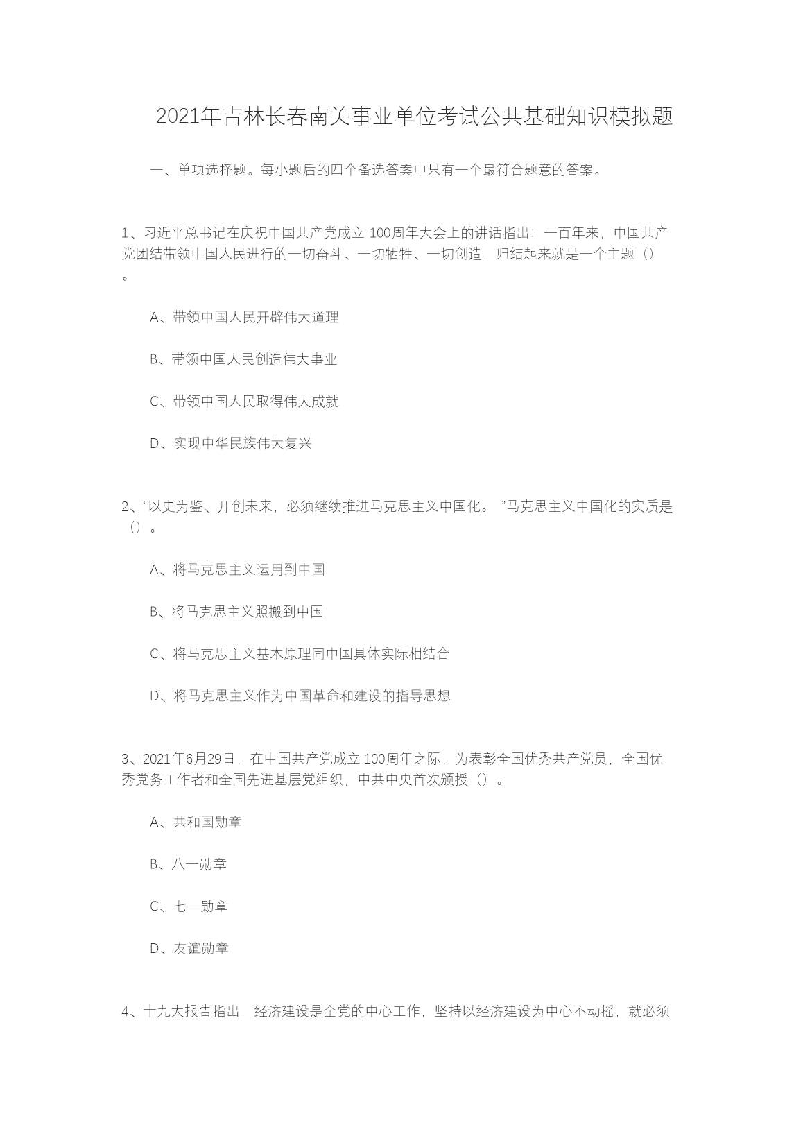 【文档预览】 文档大全网整理发布2021年吉林长春南关事业单位考试公共基础知识模拟题(Word版),前五页预览如下: