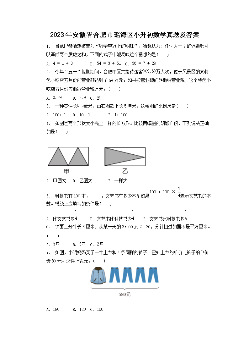2023年安徽省合肥市瑶海区小升初数学真题及答案(Word版)09-22