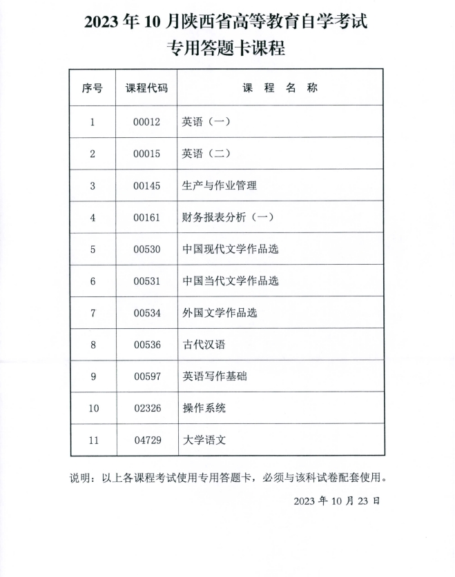 2023年10月陕西省自学考试传统卷课程、专用答题卡课程信息公布10-25