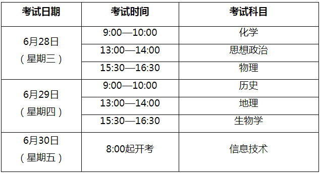 (2)6月28日下午思想政治科目考试,13:15起禁止考生进入考点,13:30考生可提前交卷离场。