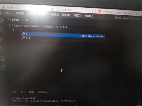 6、我们在html文件上输入【!】叹号(在英文状态下),然后按键盘的【Tab】键,只有在这种情况下按住Tab键才有用,如图所示。