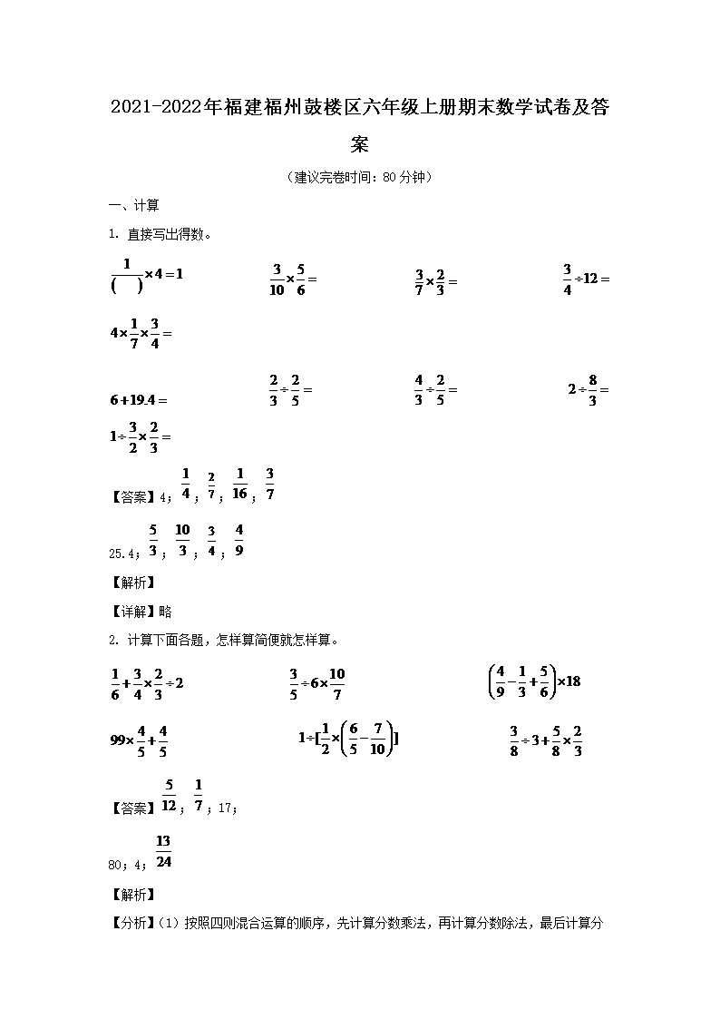 【文档预览】 文档大全网整理发布2021-2022年福建福州鼓楼区六年级上册期末数学试卷及答案(Word版),前五页预览如下: