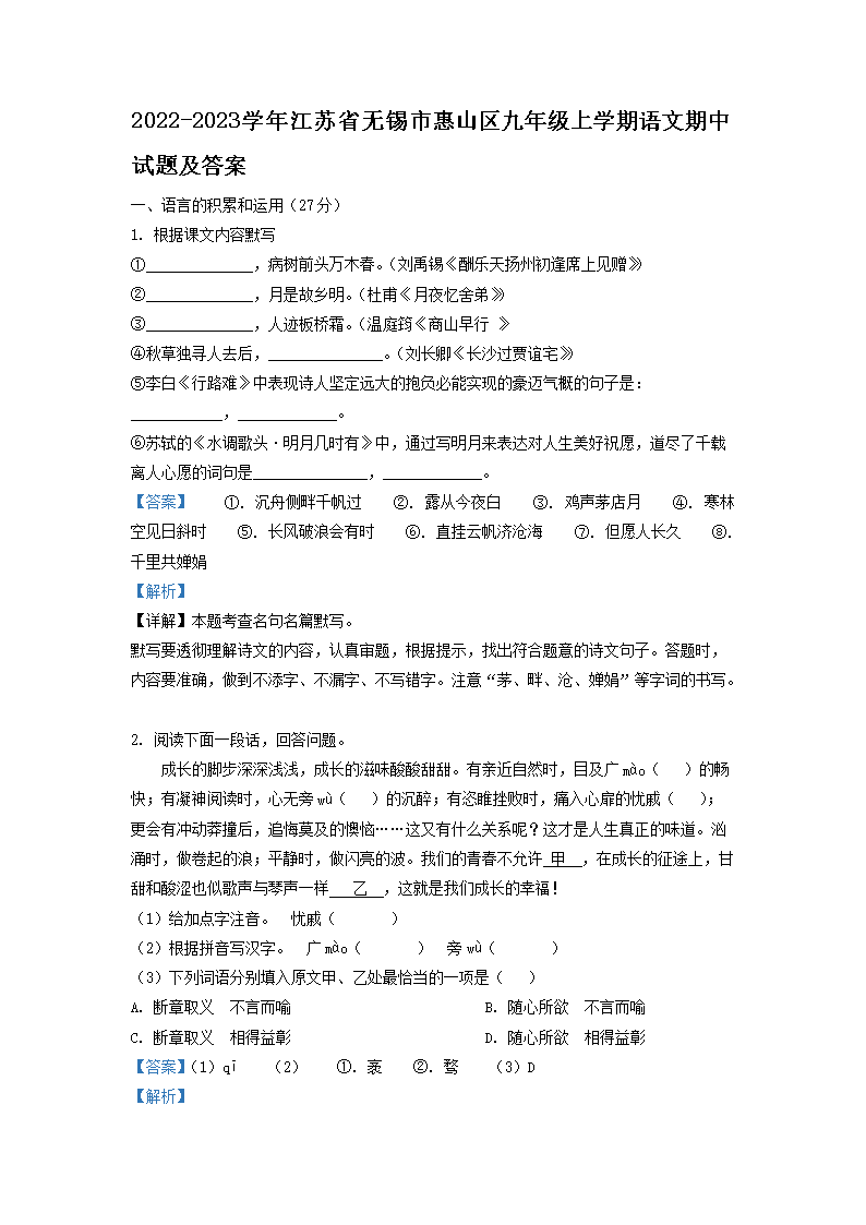2022-2023学年江苏省无锡市惠山区九年级上学期语文期中试题及答案(Word版)09-12