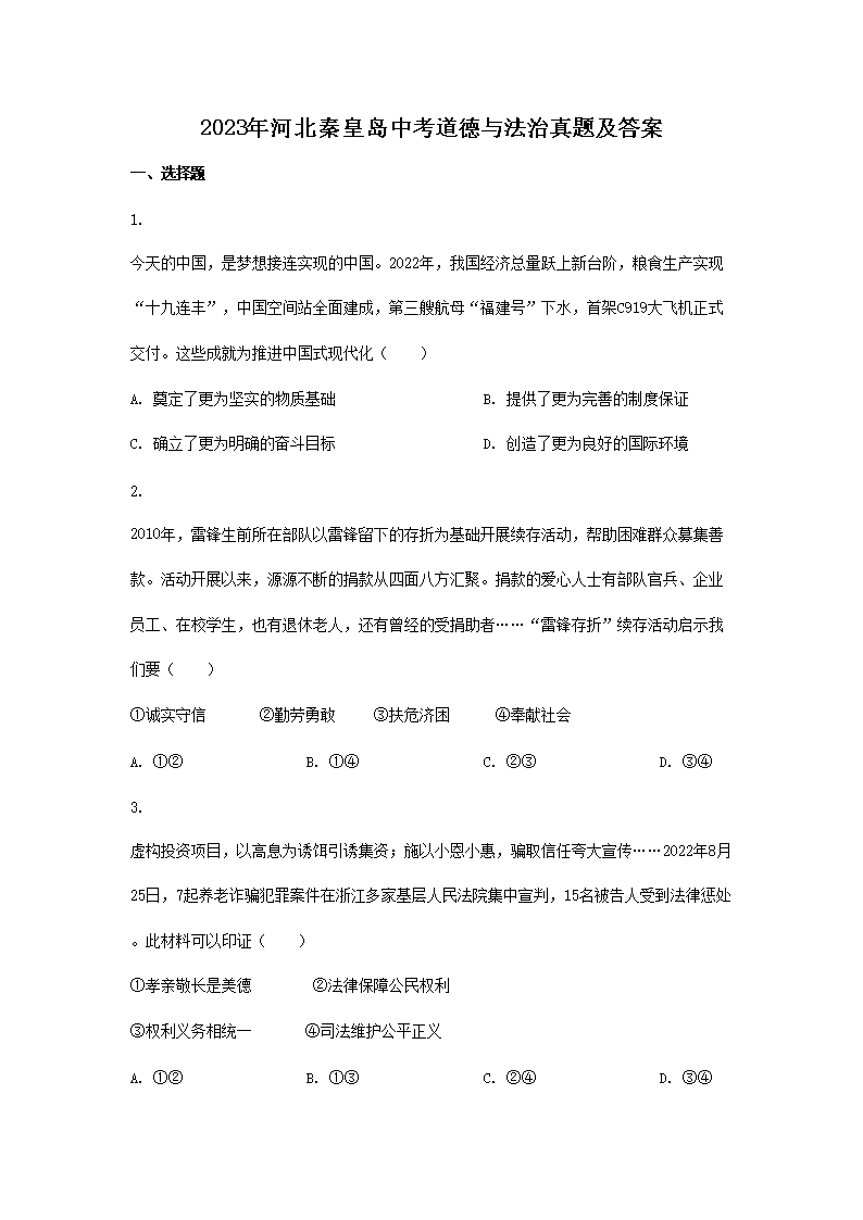 2023年河北秦皇岛中考道德与法治真题及答案(Word版)07-01
