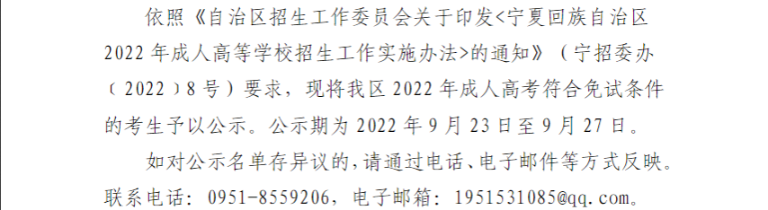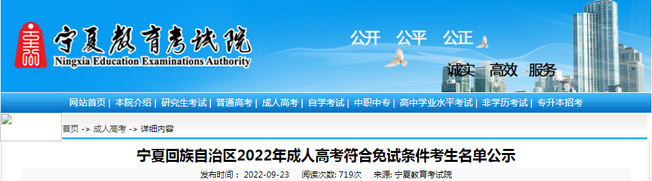 原文标题:宁夏回族自治区2022年成人高考符合免试条件考生名单公示