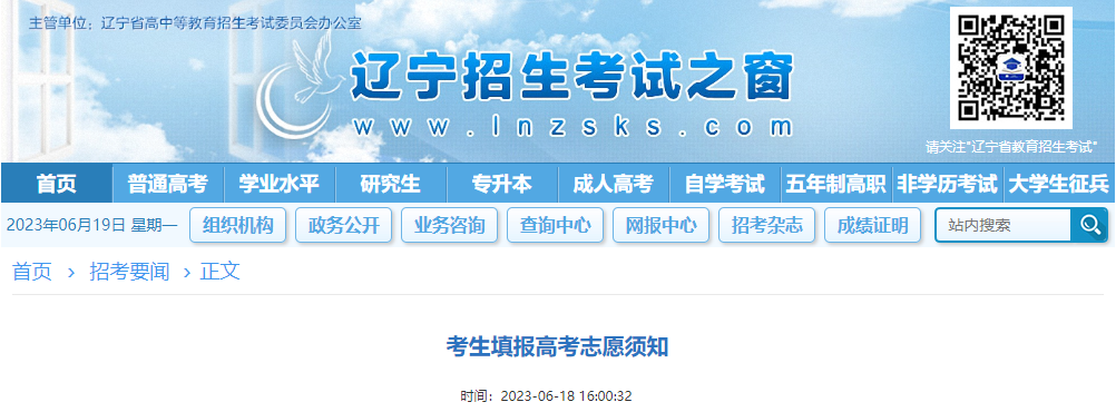 2023年辽宁省普通高考志愿实行网上填报(含“征集志愿”),考生须关注“辽宁招生考试之窗”网站,了解我省有关招生政策及招生计划,关注有关高校的官方网站,认真阅读《招生章程》,并按有关要求、规定程序和时间完成高考志愿填报。