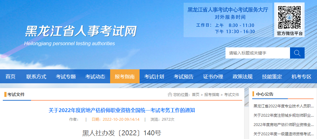 2022年黑龙江房地产估价师报名时间:2022年10月21日-10月24日,报名工作采用网上报名的方式,符合条件的报考人员通过“黑龙江人事考试网”在线填写提交报考信息,并按相关规定办理网上缴费手续。