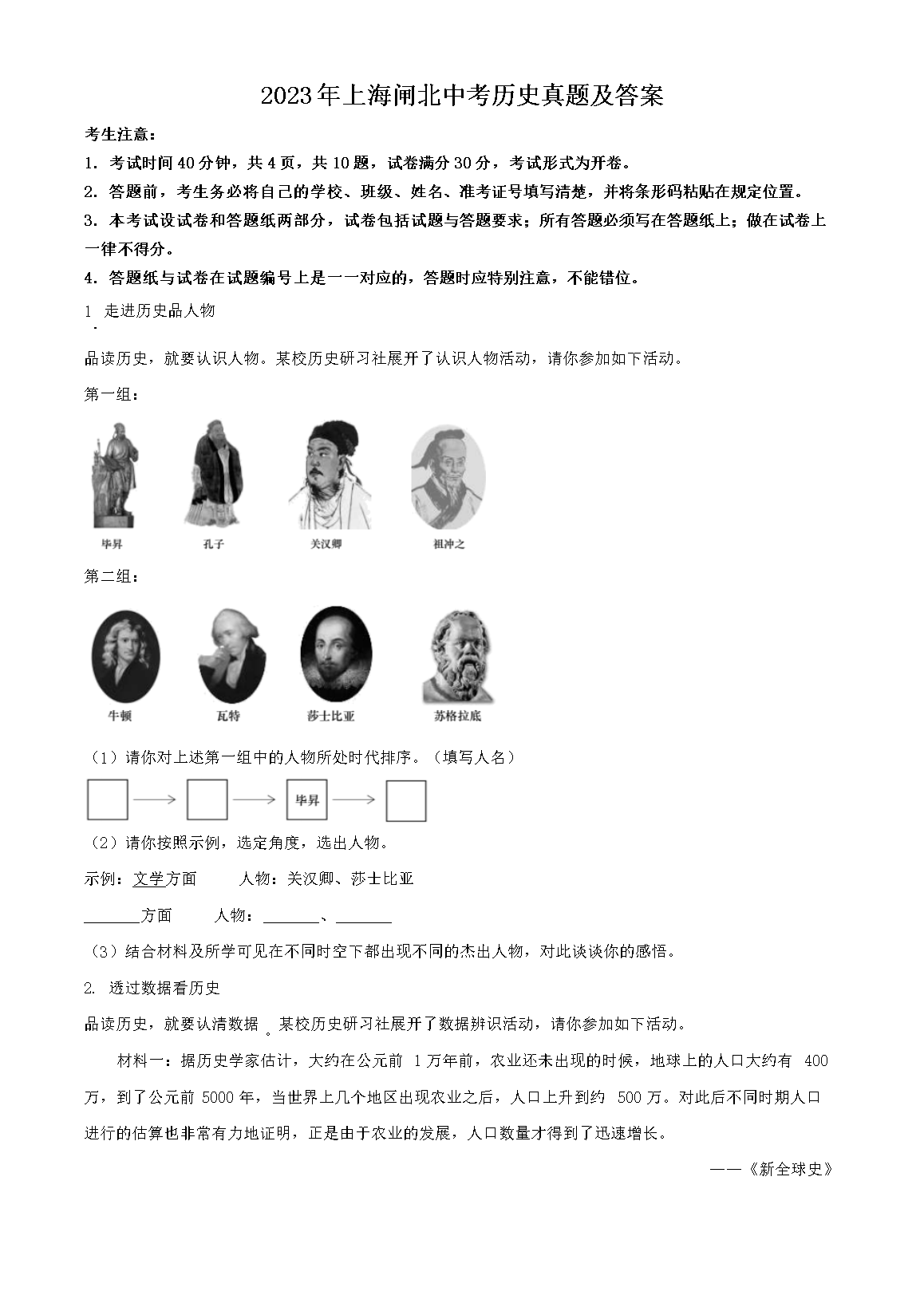 2023年上海闸北中考历史真题及答案(Word版)10-24