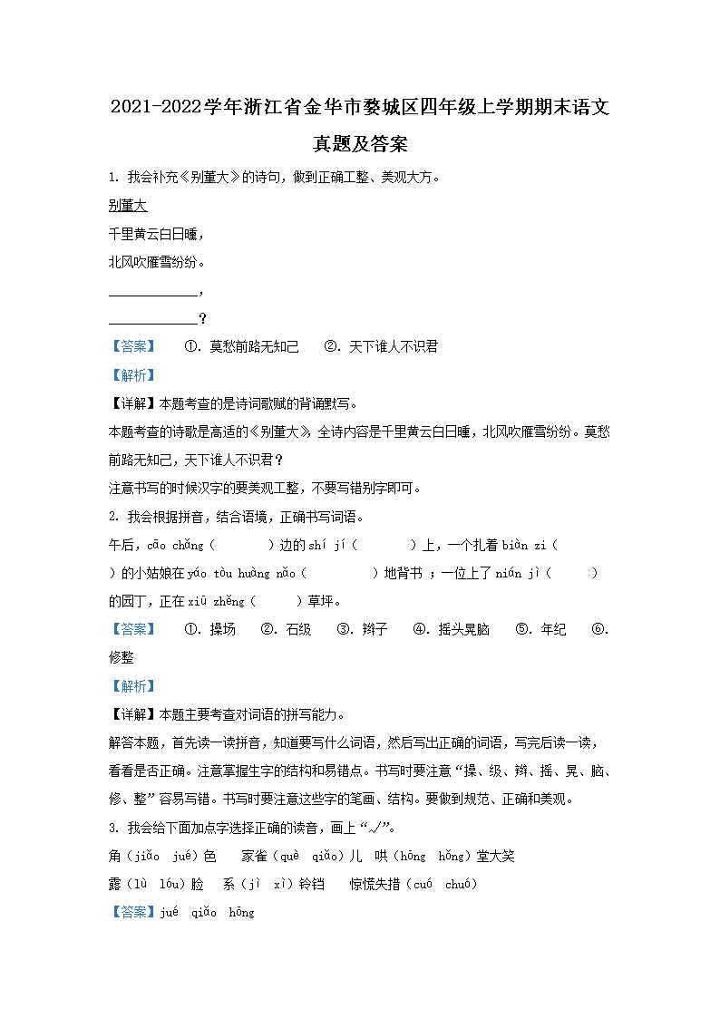 【文档预览】 文档大全网整理发布2021-2022学年浙江省金华市婺城区四年级上学期期末语文真题及答案(Word版),前五页预览如下: