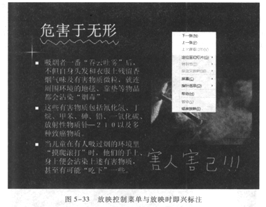 放映过程中,可能要强调或勾画某些重点内容,也可能临时即兴勾画标注。为了从放映状态 转换到标注状态,可以将鼠标指针放在放映控制菜单的“指针选项”,在出现的子菜单中单击“笔”命令(或“荧光笔”命令),鼠标指针呈圆点状,按住鼠标左键即可在幻灯片上勾画书写。如图5—33所示。