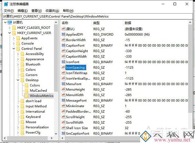 2.我们在注册表编辑器中依次展开至“HKEY_CURRENT_USER\Control Panel\Desktop\WindowMetrics”,如下图所示。